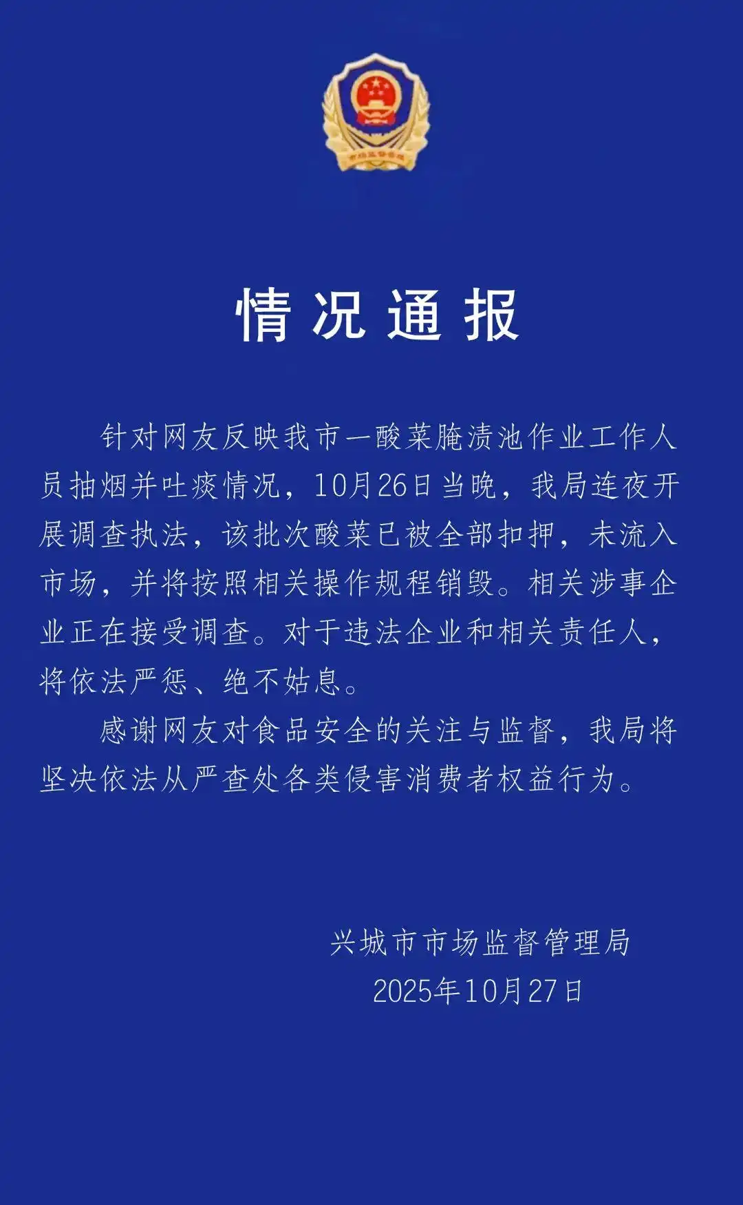 10月27日,遼寧省興城市市場(chǎng)監(jiān)督管理局通過(guò)微信公眾號(hào)“興城市市場(chǎng)監(jiān)督管理局”發(fā)布情況通報(bào)稱,針對(duì)網(wǎng)友反映的情況,10月26日當(dāng)晚,該局連夜開展調(diào)查執(zhí)法,該批次酸菜已被全部扣押,未流入市場(chǎng),并將按照相關(guān)操作規(guī)程銷毀。涉事企業(yè)正在接受調(diào)查。對(duì)于違法企業(yè)和相關(guān)責(zé)任人,將依法嚴(yán)懲、絕不姑息。隨后,中國(guó)新聞網(wǎng)、光明網(wǎng)、觀察者網(wǎng)等媒體轉(zhuǎn)發(fā)報(bào)道。