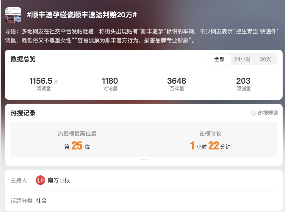 隨后,極目新聞、紅星新聞、上游新聞等媒體接力傳播,推高輿情熱度,微博話題“#順豐速孕碰瓷順豐速運判賠20萬#”登上熱搜榜第25位。