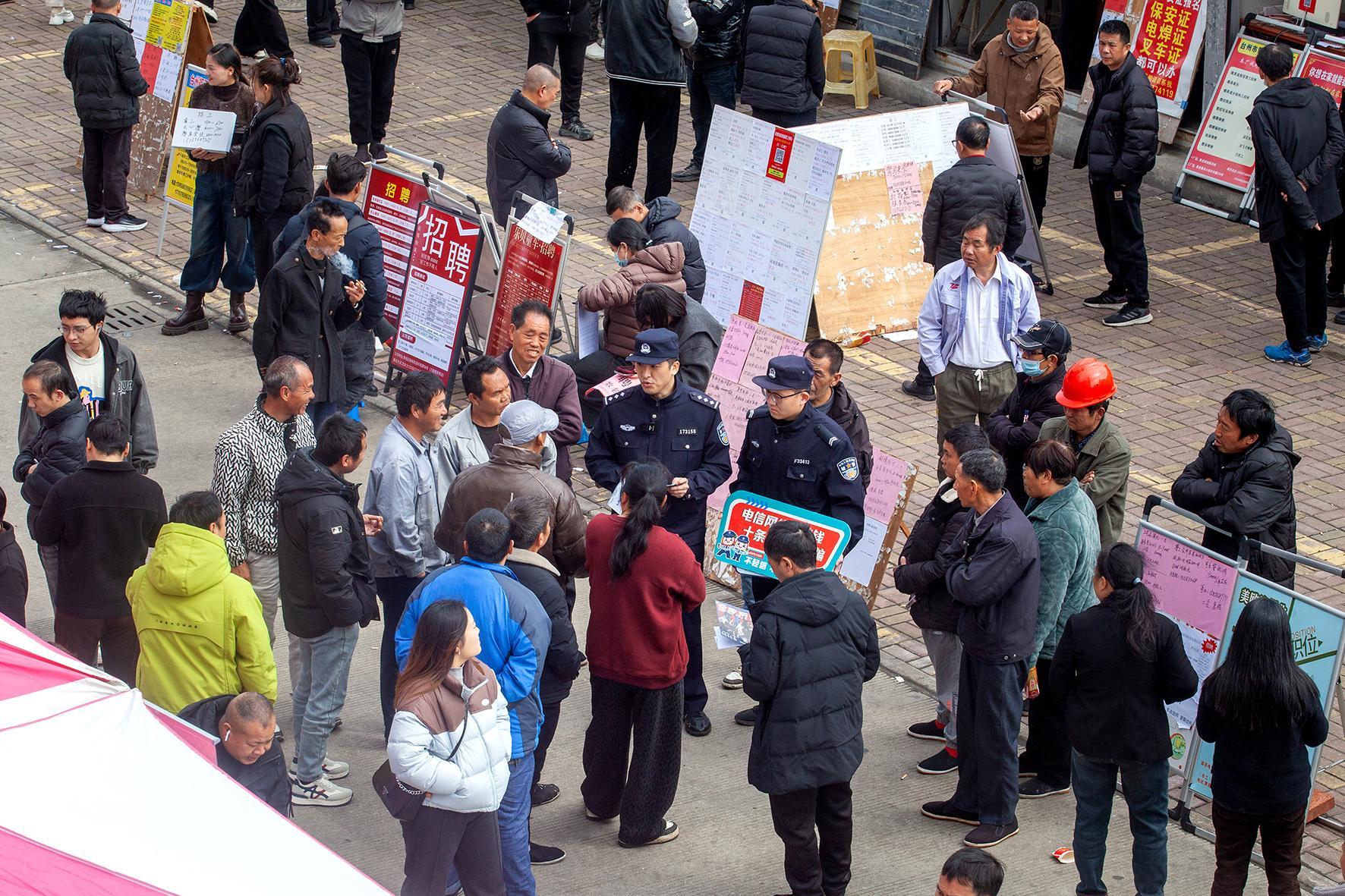 2月25日,湖北省沙洋縣濱江新區(qū)“春風(fēng)行動”專場招聘會上,沙洋縣公安局洪嶺派出所民警現(xiàn)場為求職者拆解“高薪誘惑”“先交費(fèi)后上崗”等招聘騙局套路。