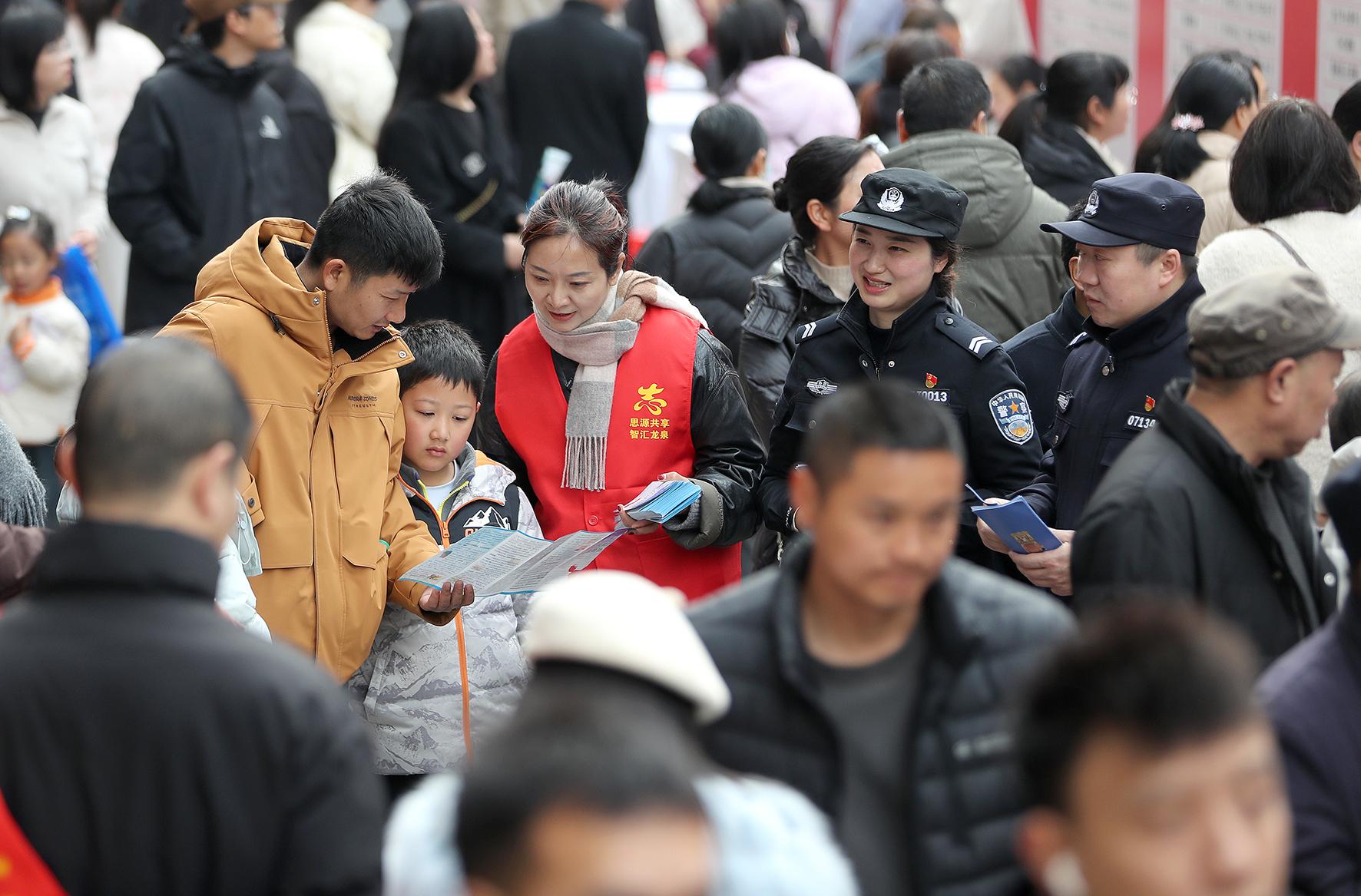 2月27日,在湖北省荊門市東寶區(qū)“春風(fēng)行動”招聘會現(xiàn)場,荊門市公安局東寶區(qū)分局民警聯(lián)合龍泉街道禁毒志愿者,帶著禁毒宣傳手冊、仿真毒品模型,向求職者開展禁毒普法宣傳。
